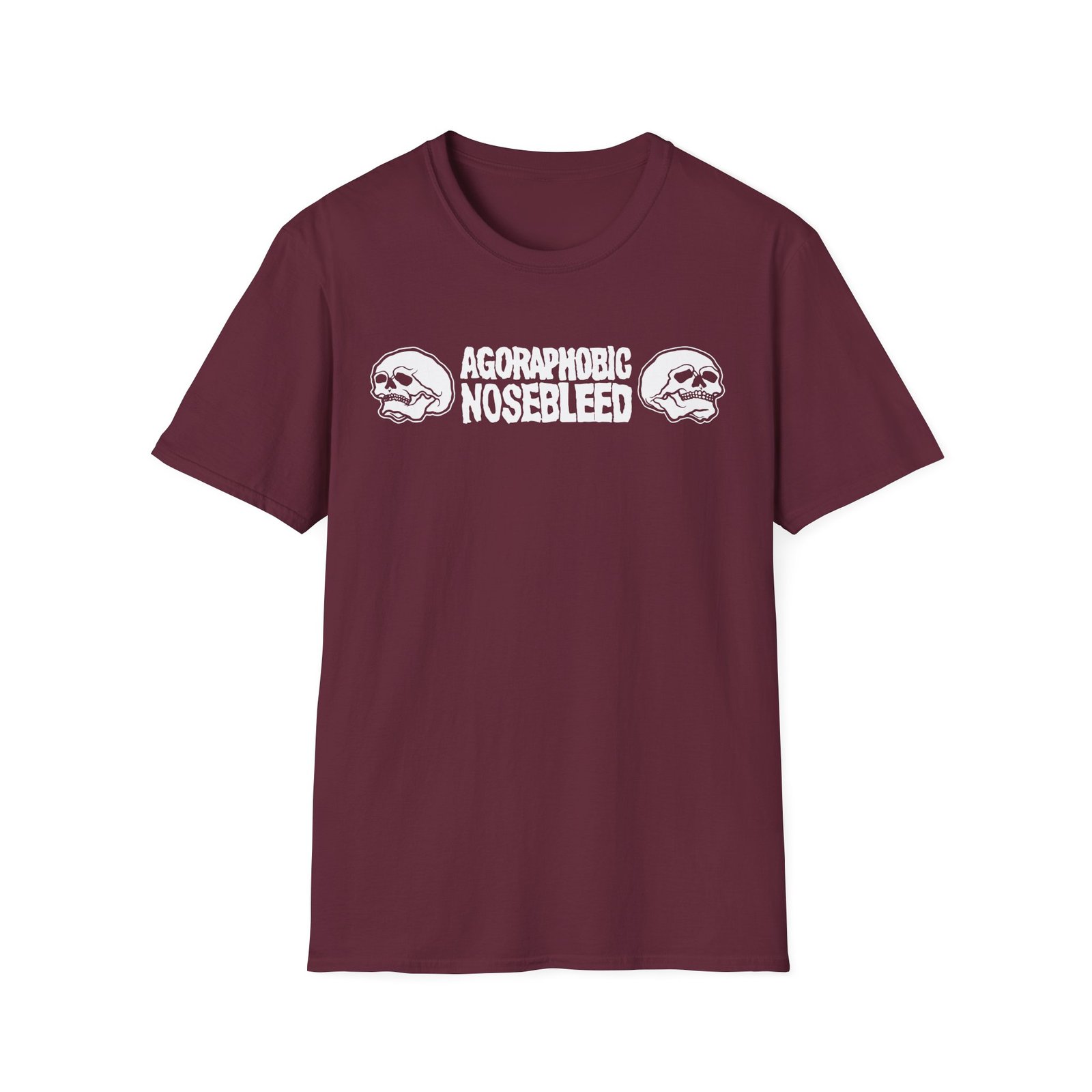 The Agoraphobic Nosebleed Skulls unisex soft-style t-shirt puts a new spin on casual comfort. Made from very soft materials, this tee is 100% cotton for solid colors. Heather colors and sports grey include polyester. The shoulders have twill tape for improved durability. There are no side seams. The collar is made with ribbed knitting to prevent curling damage.
