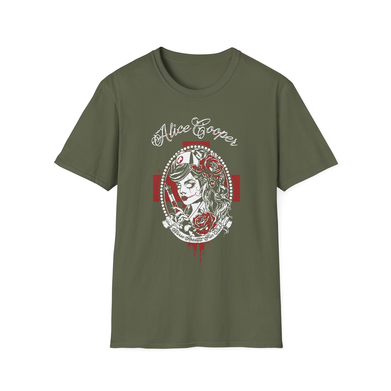 The Alice Cooper Nurse Rosetta unisex soft-style t-shirt puts a new spin on casual comfort. Made from very soft materials, this tee is 100% cotton for solid colors. Heather colors and sports grey include polyester. The shoulders have twill tape for improved durability. There are no side seams. The collar is made with ribbed knitting to prevent curling damage.