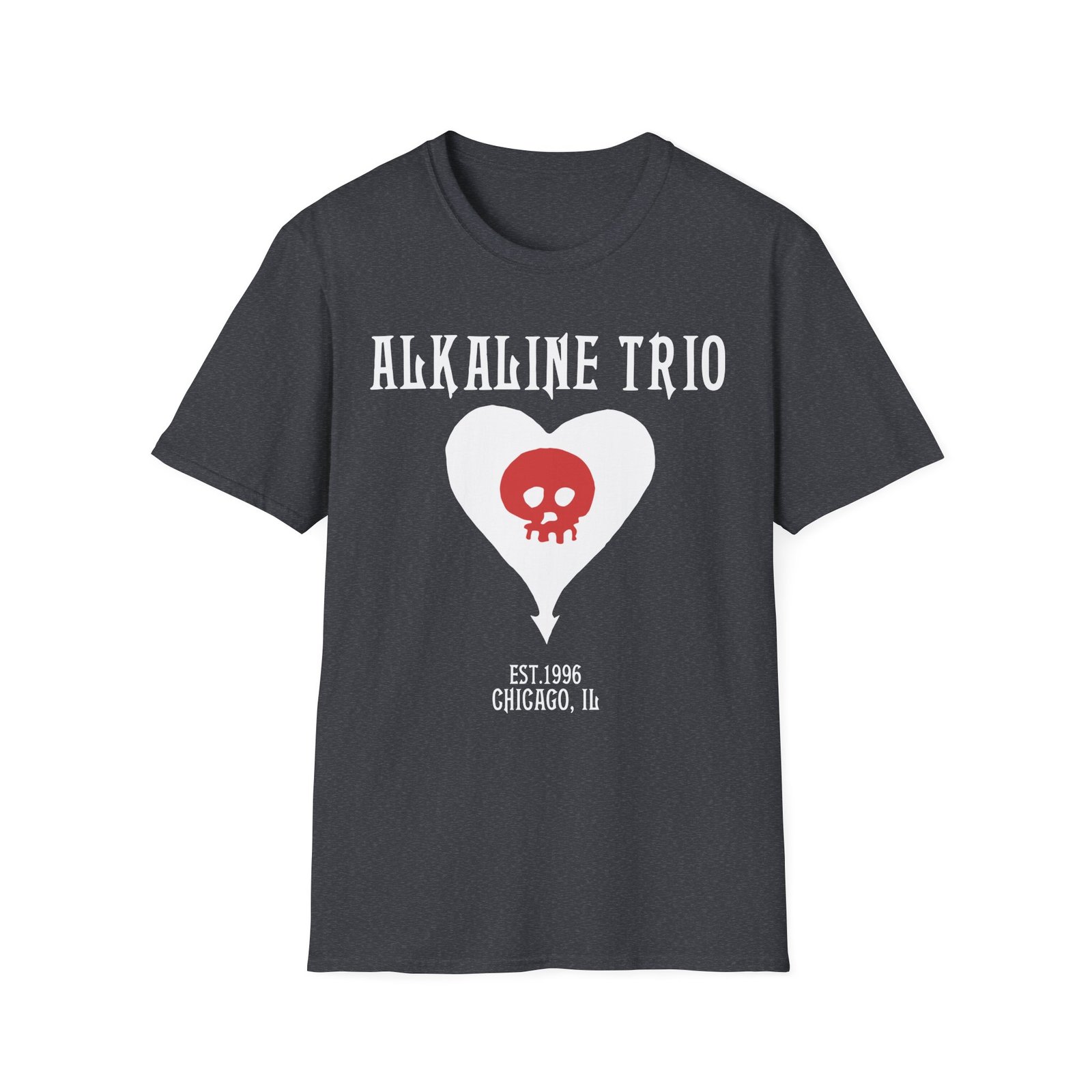 The Alkaline Trio Heartskull Album Icons unisex soft-style t-shirt puts a new spin on casual comfort. Made from very soft materials, this tee is 100% cotton for solid colors. Heather colors and sports grey include polyester. The shoulders have twill tape for improved durability. There are no side seams. The collar is made with ribbed knitting to prevent curling damage.