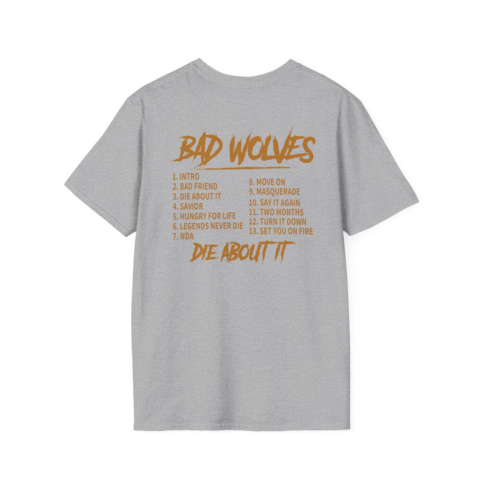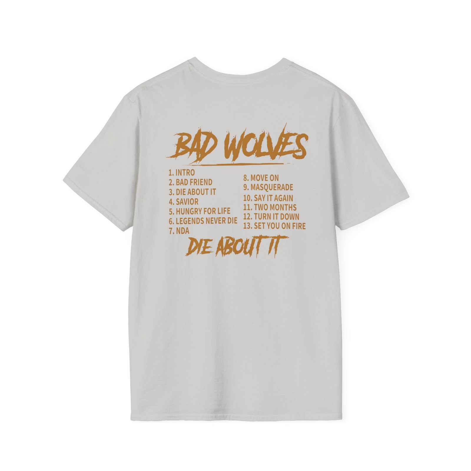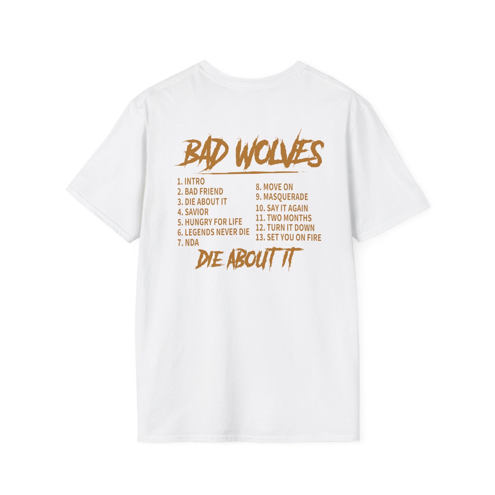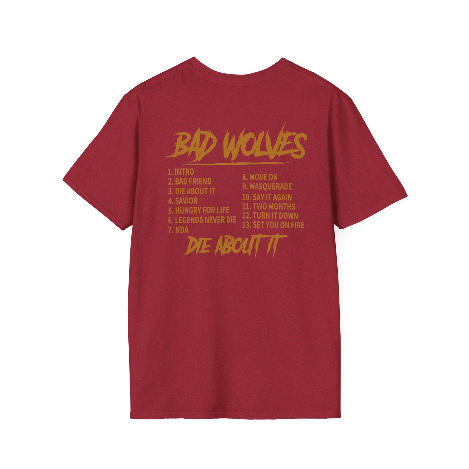 Unleash your inner rebel with this striking Bad Wolves Die About It Tracklist Unisex Softstyle T-Shirt, perfect for music lovers and trendsetters alike. Featuring a bold graphic design on the front and poignant lyrics on the back, this shirt channels a vibe of artistic expression and individuality. Ideal for casual outings, concerts, or simply lounging around, it invites you into a world of creativity and self-expression. A perfect gift for friends, family, or fans of the genre, this tee shines during holidays, music festivals, or any celebration of life and music.