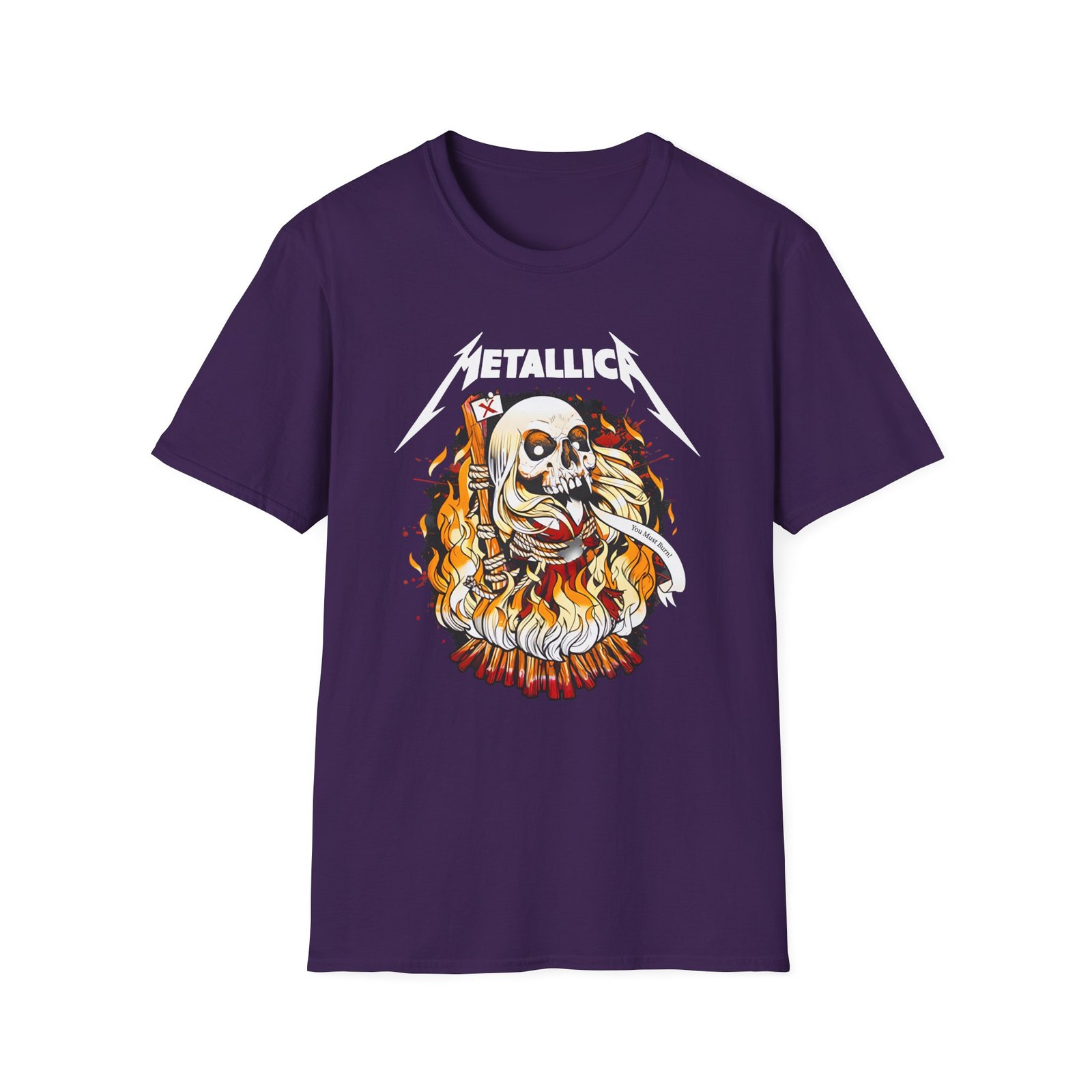 The Metallica You Must Burn! unisex soft-style t-shirt puts a new spin on casual comfort. Made from very soft materials, this tee is 100% cotton for solid colors. Heather colors and sports grey include polyester. The shoulders have twill tape for improved durability. There are no side seams. The collar is made with ribbed knitting to prevent curling damage.