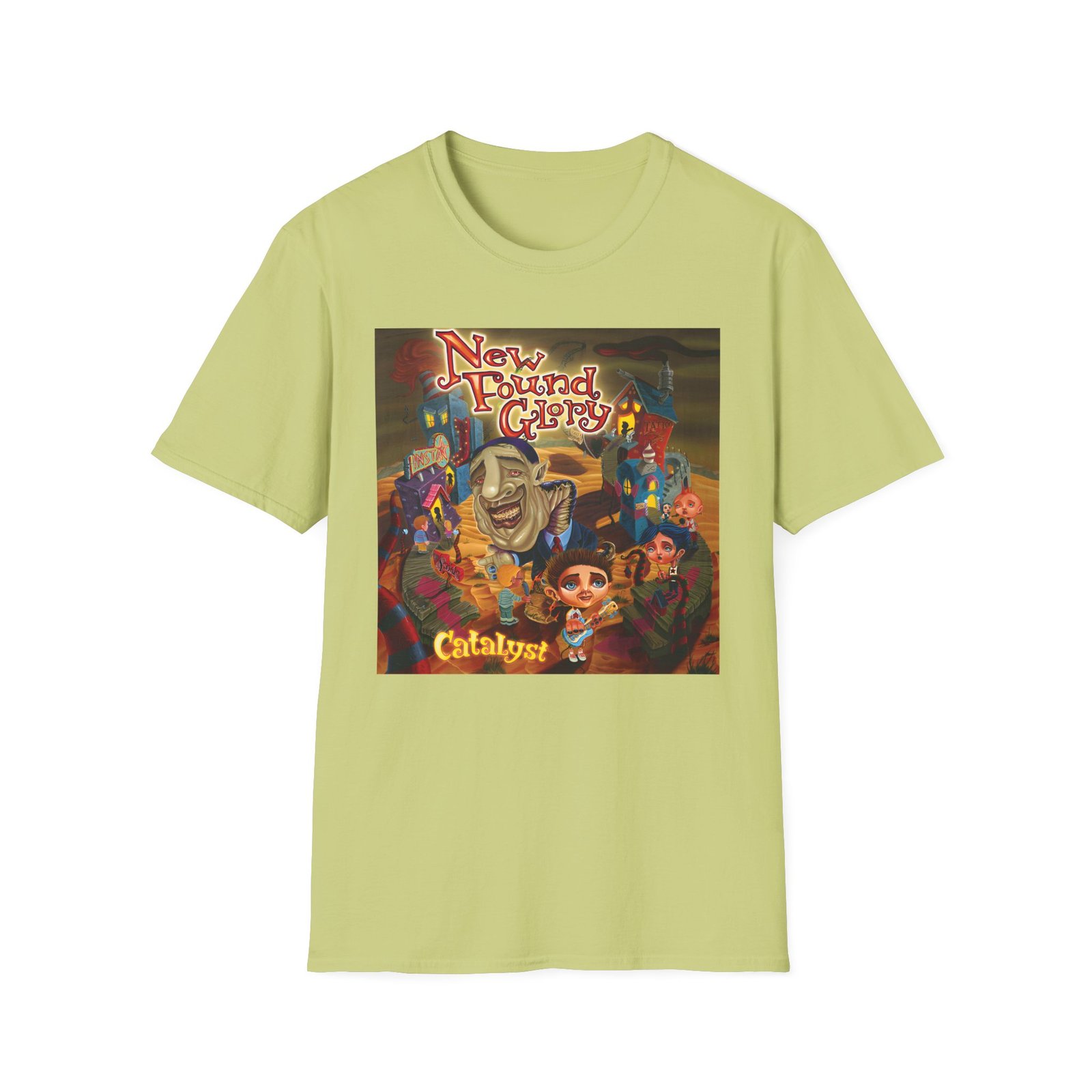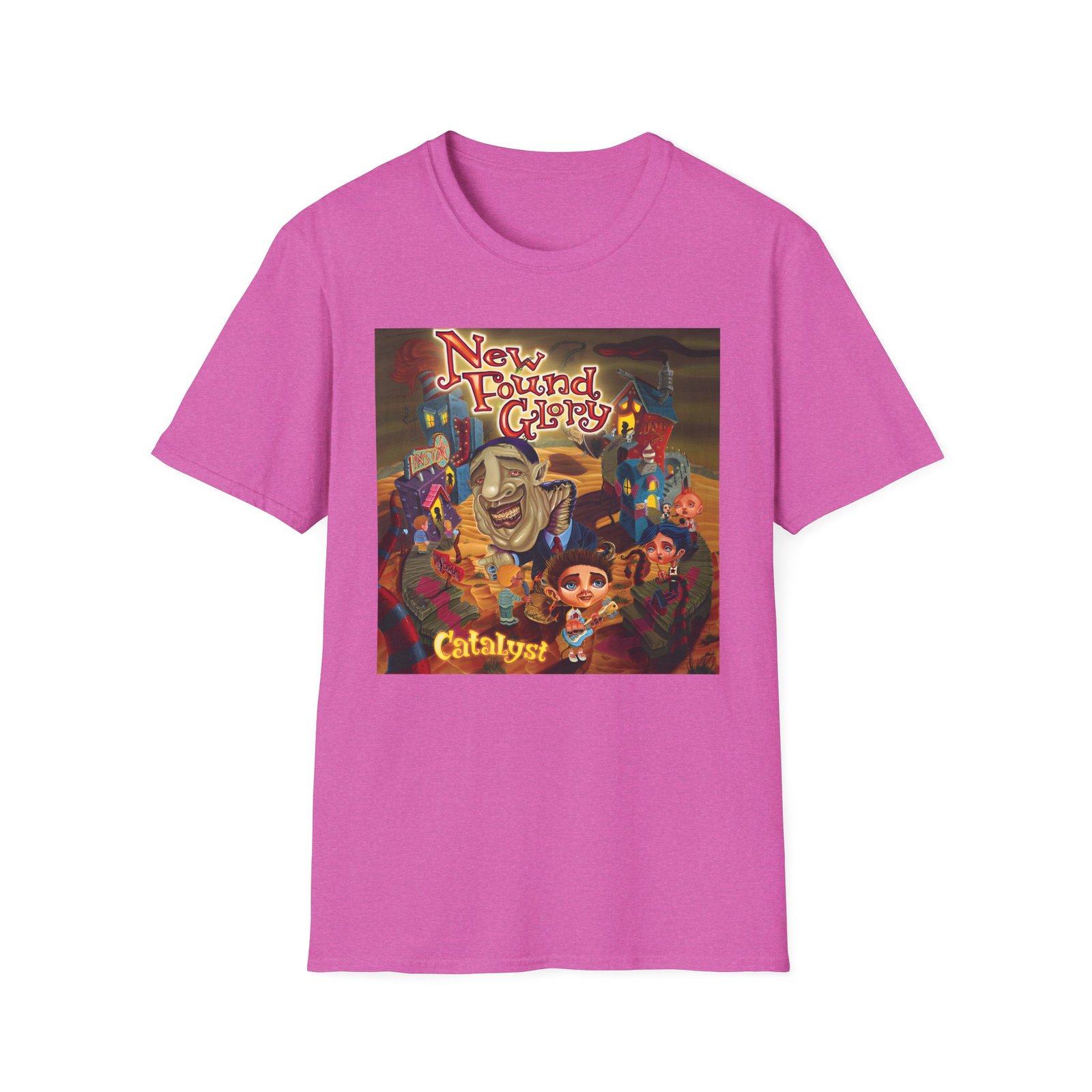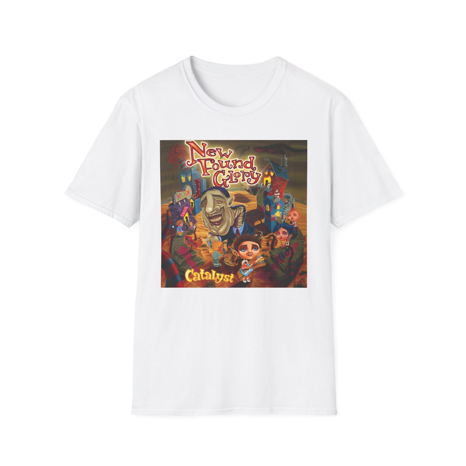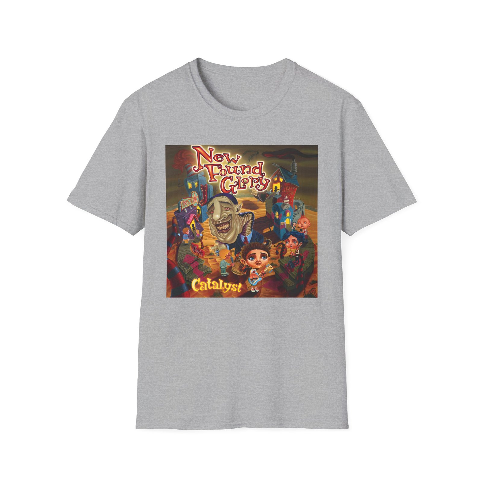 The New Found Glory Catalyst Album Cover unisex soft-style t-shirt puts a new spin on casual comfort. Made from very soft materials, this tee is 100% cotton for solid colors. Heather colors and sports grey include polyester. The shoulders have twill tape for improved durability. There are no side seams. The collar is made with ribbed knitting to prevent curling damage.