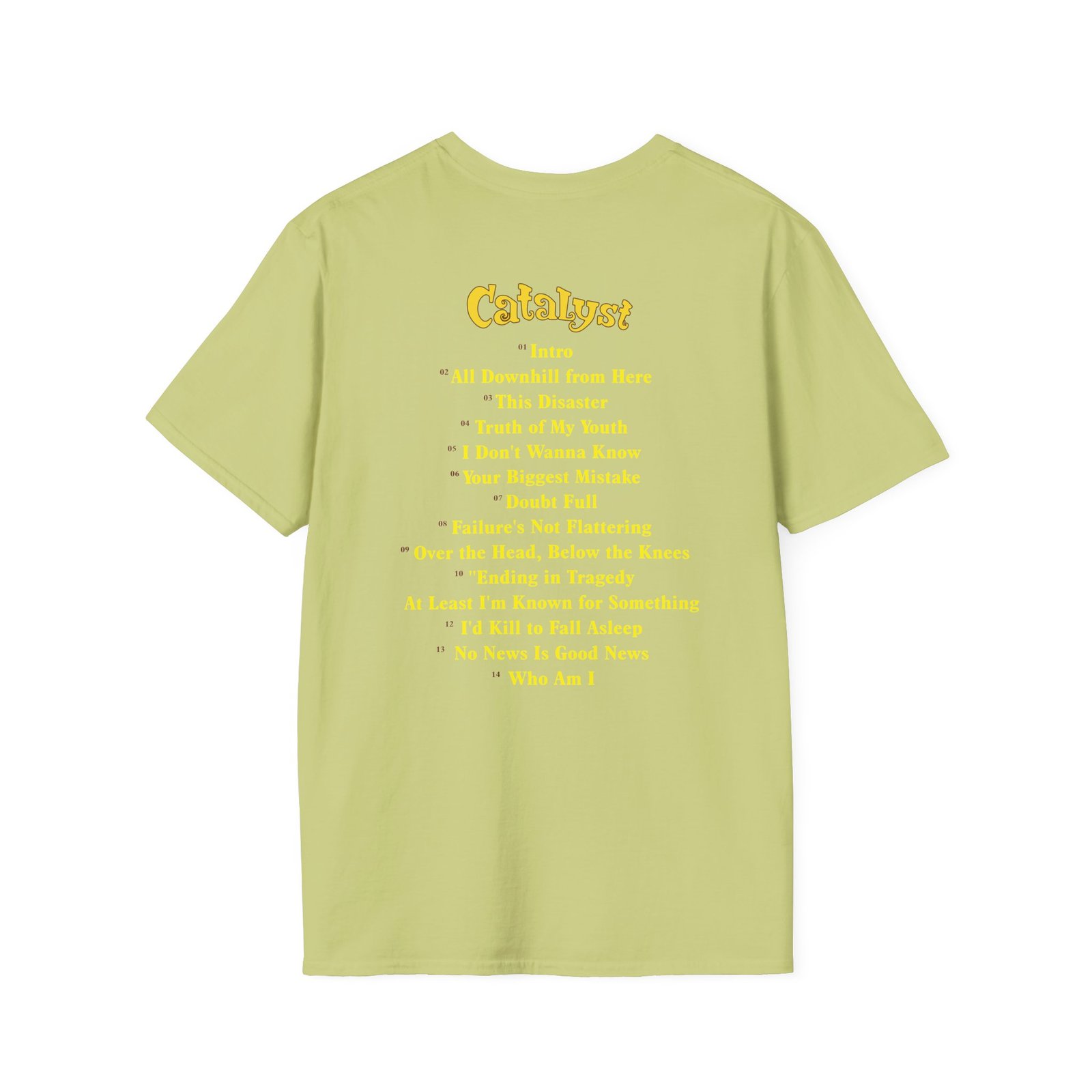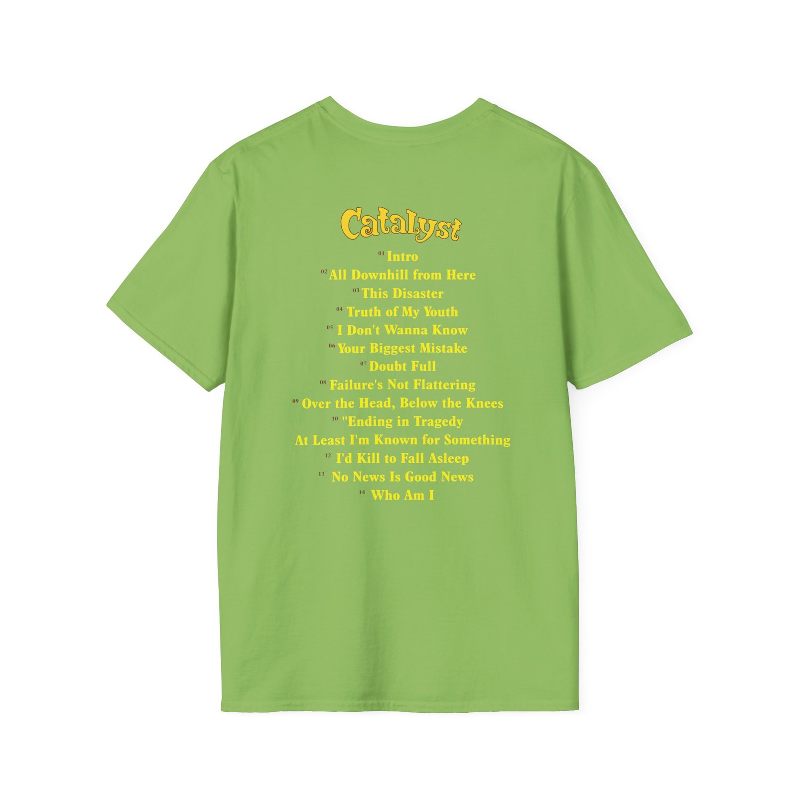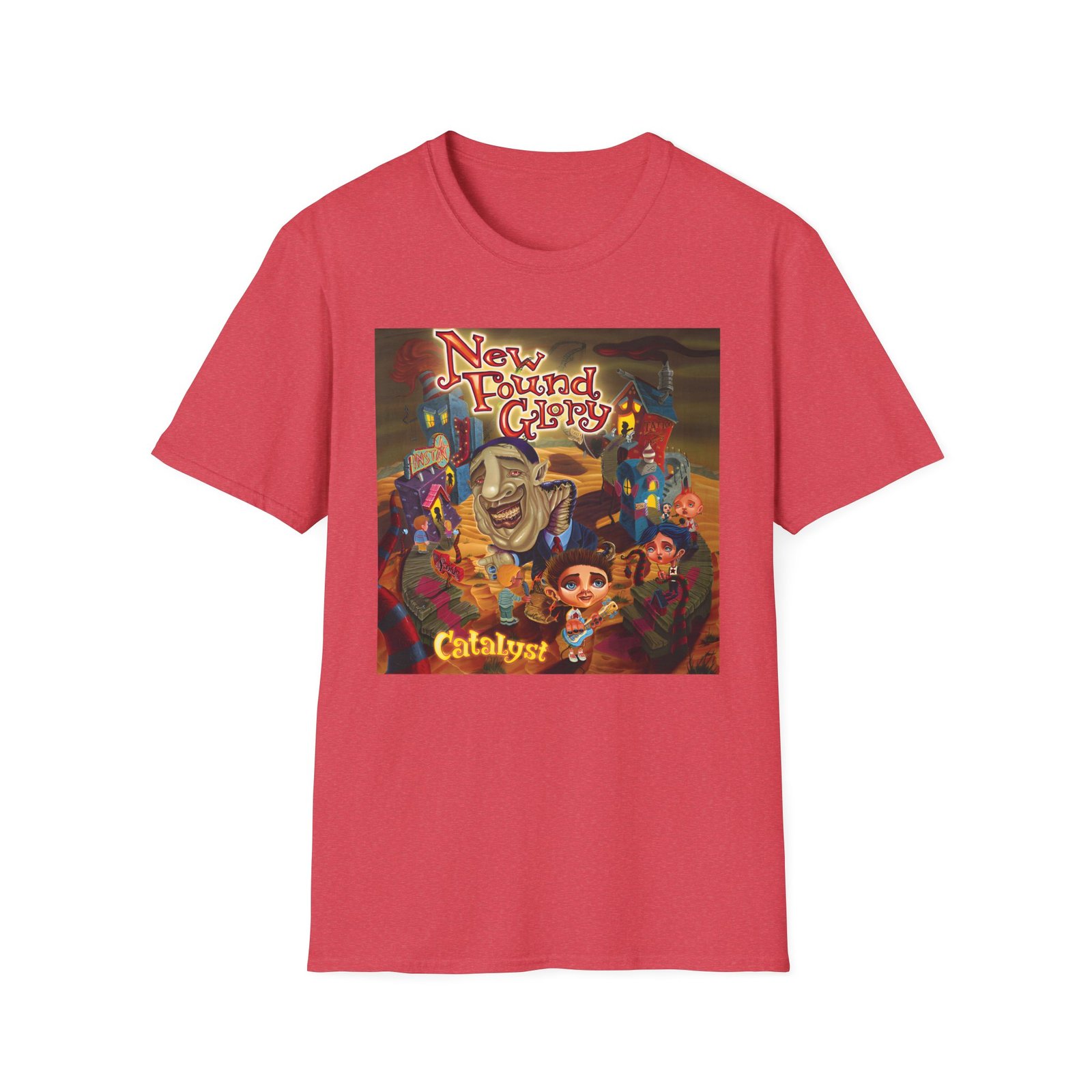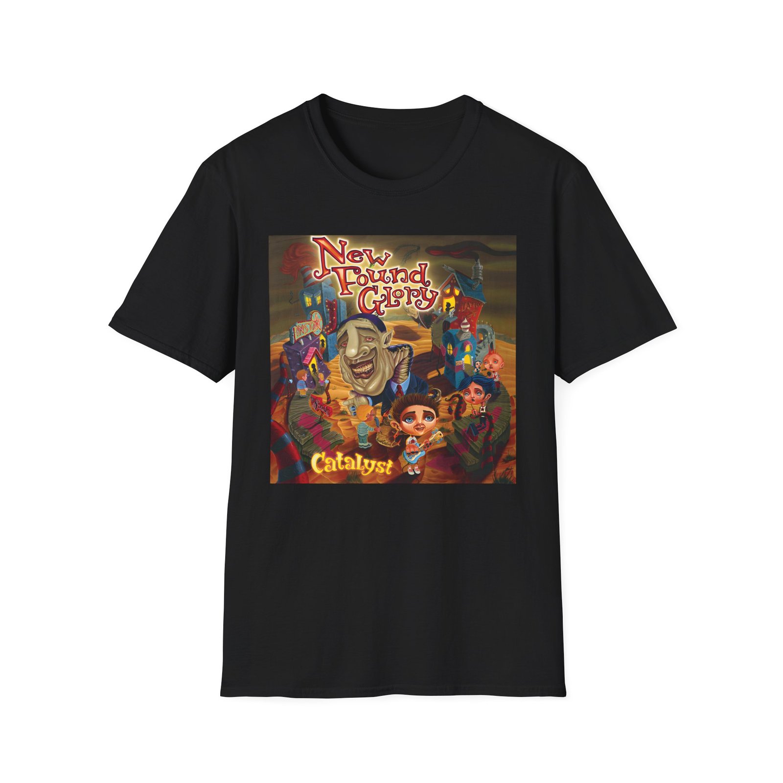 The New Found Glory Catalyst Album Cover unisex soft-style t-shirt puts a new spin on casual comfort. Made from very soft materials, this tee is 100% cotton for solid colors. Heather colors and sports grey include polyester. The shoulders have twill tape for improved durability. There are no side seams. The collar is made with ribbed knitting to prevent curling damage.