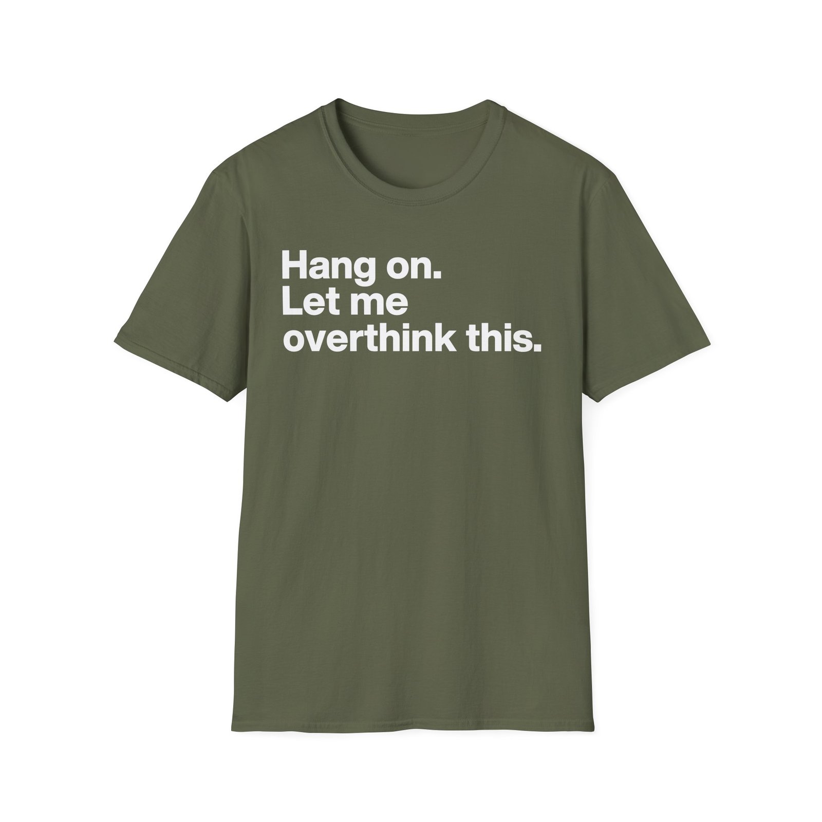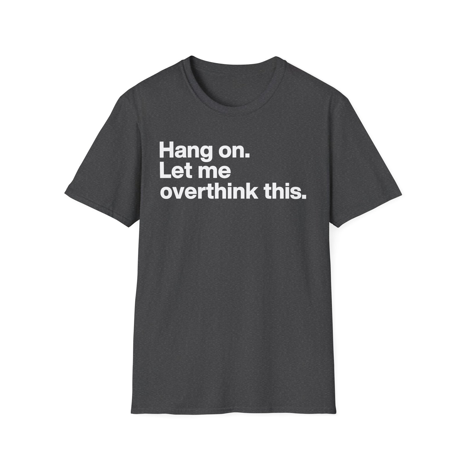 The Mordlust Hang on Let Me Overthink This unisex soft-style t-shirt puts a new spin on casual comfort. Made from very soft materials, this tee is 100% cotton for solid colors. Heather colors and sports grey include polyester. The shoulders have twill tape for improved durability. There are no side seams. The collar is made with ribbed knitting to prevent curling damage.